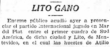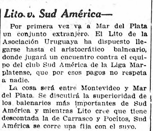 Enorme acontecimiento e histórico para el Club Atlético Lito y el Fútbol Uruguay, que fue el primer equipo extranjero en jugar en Mar del Plata , por ende el primer club uruguayo en jugar en mencionada ciudad.