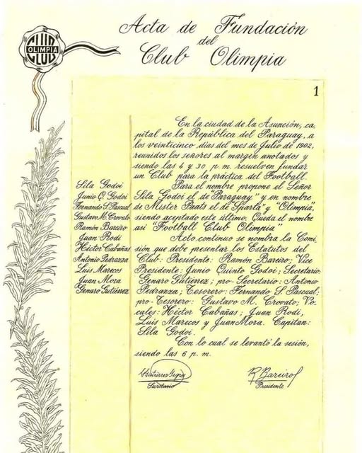 Durante la tarde se debatieron distintos nombres para la nueva entidad. El dueño de casa propuso llamarla “Paraguay”, otros sugirieron “Esparta”, evocando valores de lucha y honor. Sin embargo, fue la propuesta de William Paats la que finalmente se impuso: “Football Club Olimpia”, en homenaje a la ciudad griega donde los atenienses disputaban las competencias que hoy conocemos como Juegos Olímpicos. Así nació Olimpia, el club más antiguo del Paraguay y uno de los más antiguos de Sudamérica.