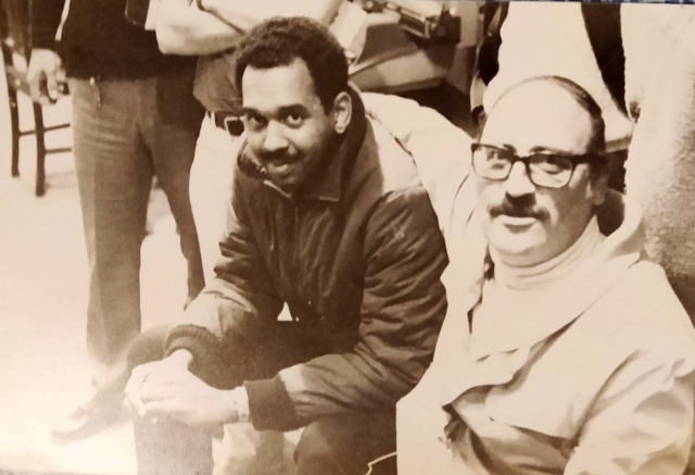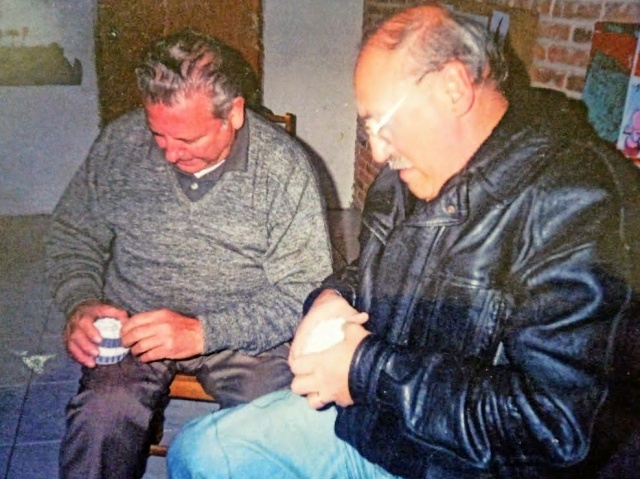 La foto lo muestra con un gesto sereno, acompañado por otra persona que lo recibe o lo reconoce, rodeado de símbolos que hablan de una vida dedicada al oficio: trofeos, diplomas, recuerdos silenciosos que funcionan como testigos mudos de su trayectoria.