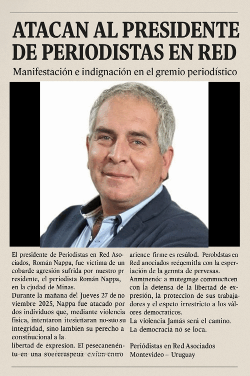El presidente de Periodistas en Red Asociados, Román Nappa, fue víctima de una violenta agresión en la ciudad de Minas, Lavalleja, durante la mañana del jueves 27 de noviembre de 2025. Según el comunicado oficial emitido por la asociación, dos individuos atacaron físicamente al periodista con el objetivo de amedrentarlo por opiniones expresadas en el ejercicio de su labor profesional.